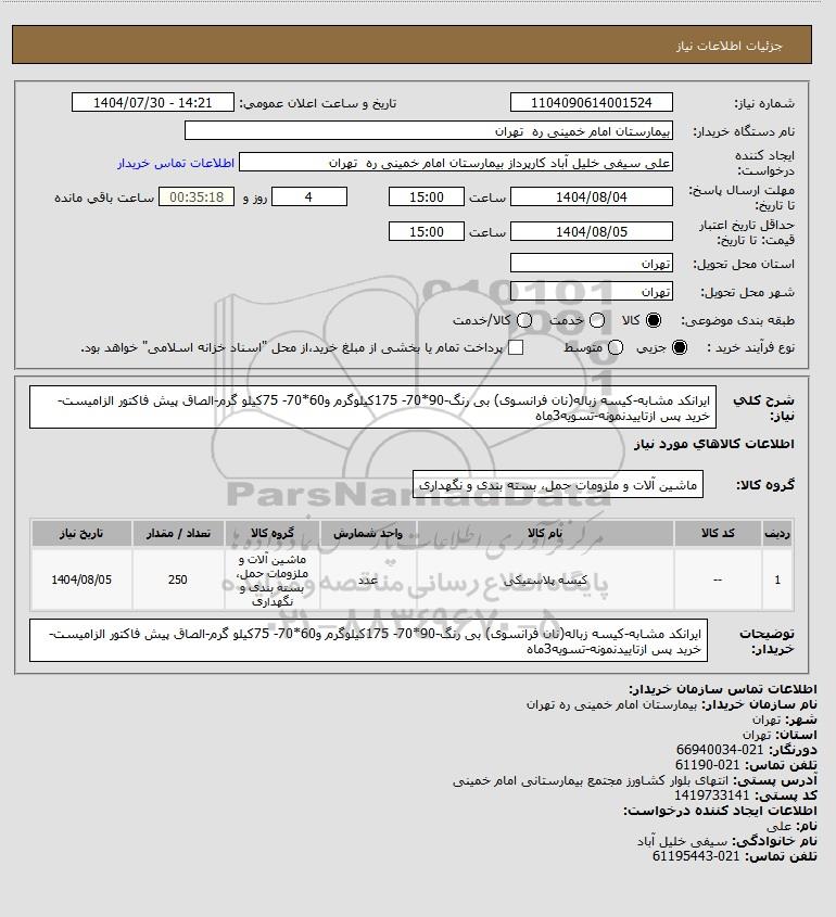 | 1 | -- | کیسه پلاستیکی | عدد | ماشین آلات و ملزومات حمل، بسته بندی و نگهداری | 250 | 1404/08/05 |