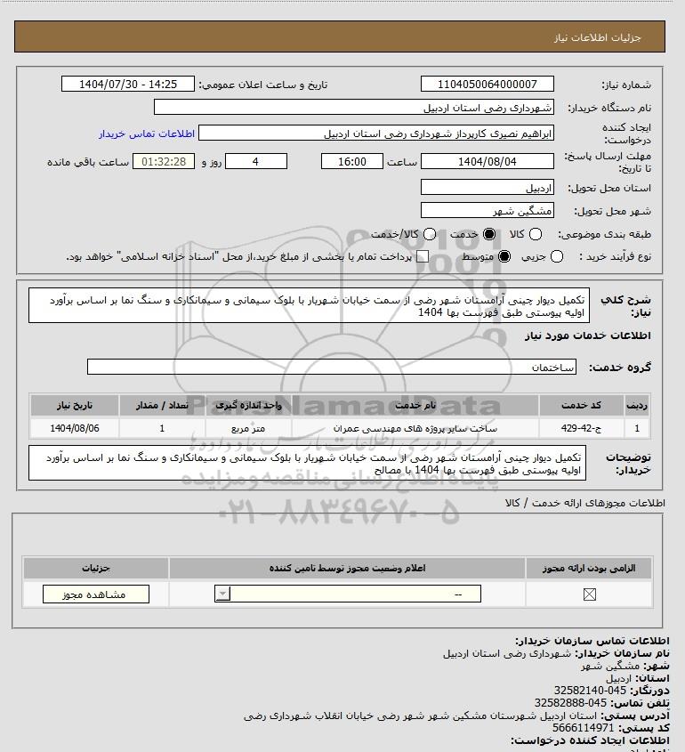 شرح کلی نیاز: تکمیل دیوار چینی آرامستان شهر رضی از سمت خیابان شهریار با بلوک سیمانی و سیمانکاری و سنگ نما بر اساس برآورد اولیه پیوستی طبق فهرست بها 1404
