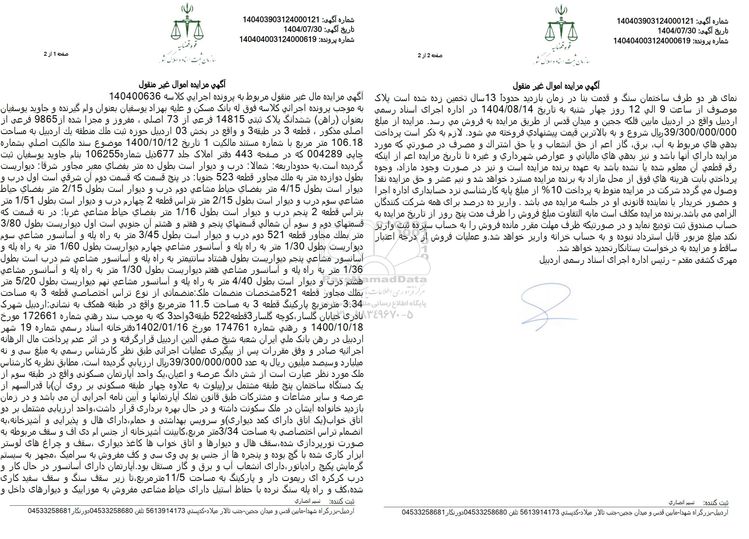 اگهی مزایده مال غیر منقول مربوط به پرونده اجرایی کلاسه 140400636 به موجب پرونده اجرائD كلاسه فوق له بانک مسکن و علیه بهزاد یوسفیان بعنوان وام گیرنده و جاوید یوسفیان بعنوان (راهن) ششدانگ پلاک ثبتی 14815 فرعی از 73 اصلی، مفروز و مجزا شده از 9865 فرعی از اصلی مذکور ، قطعه 3 در طبقه 3 و واقع در بخش 03 اردبیل حوزه ثبت مل; منطقه یک اردبیل به مساحت 106.18 متر مربع با شماره مستند مالکیت 1 تاريخ 1400.10.12 موضوع سند مالكيت اصلي بشماره چاپی 004289 که در صفحه 443 دفتر املاک جلد 677 ذیل شماره 106255 بنام جاوید یوسفیان ثبت گردیده است. به حدود اربعه شمالا درب و دیوار است بطول ده متر بفضاي معبر مجاور شرقا دیواریست بطول دوازده متر به ملك مجاور قطعه 523 جنوبا در پنج قسمت که قسمت دوم آن شرقی است اول درب و دیوار است بطول 4.15 متر بقضاي حياط مشاعی دوم درب و دیوار است بطول 2.15 متر بفضاي حياط مشاعی سوم درب و دیوار است بطول 2.15 متر بتراس قطعه 2 چهارم درب و دیوار است بطول 1.51 متر بتراس قطعه 2 پنجم درب و دیوار است بطول 1.16 متر بقضاي حياط مشاعي غربا در به قسمت که قسمتهای دوم و سوم ان شمالي قسمتهاي پنجم و هفتم و هشتم آن جنوبی است اول دیواریست بطول 3.80 متر بملك مجاور قطعه 521 دوم درب و دیوار است بطول 3.45 متر به راه پله و آسانسور مشاعي سوم دیواریست بطول 1.30 متر به راه پله و اسانسور مشاعی چهارم دیواریست بطول 1.60 متر به راه پله و آسانسور مشاعی پنجم دیواریست بطول هشتاد سانتیمتر به راه پله و آسانسور مشاعي شم درب است بطول 1.36 متر به راه پله و آسانسور مشاعی هفتم دیواریست بطول 1.30 متر به راه پله و آسانسور مشاعي هشتم درب و دیوار است بطول 4.40 متر به راه پله و آسانسور مشاعي نهم دیواریست بطول 5.20 متر بملك مجاور قطعه 521 مشخصات منضمات ملک منضماتی از نوع تراس اختصاصی قطعه 3 به مساحت 3.34 متر مربع پارکینگ قطعه 3 به مساحت 11.5 متر مربع واقع در طبقه همکف به نشانی اردبیل شهرک نادری خیابان گلسار، کوچه گلسار 3 قطعه 522 طبقه 3 واحد 3 که به موجب سند رهني شماره 172661 مورخ 1400.10.18 و رهني شماره 174761 مورخ 1402.01.16 دفترخانه اسناد رسمی شماره 19 شهر اردبیل در رهن بانک ملی ایران شعبه شیخ صفی الدین اردبیل قرار گرفته و در اثر عدم پرداخت مال الرهانه اجرائیه صادر و وفق مقررات پس از پیگیری عملیات اجرائی طبق نظر کارشناس رسمی به مبلغ سی و نه میلیارد و سیصد میلیون ریال به عدد 39.300.000.000 ریال ارزیابی گردیده است مطابق نظریه کارشناس ملک مورد نظر عبارت است از شش دانگ عرصه و اعیان یک واحد آپارتمان مسکونی واقع در طبقه سوم از یک دستگاه ساختمان پنج طبقه مشتمل بر پیلوت به علاوه چهار طبقه مسکونی بر روی آن با قدر السهم از عرصه و سایر مشاعات و مشترکات طبق قانون تملک آپارتمانها و آیین نامه اجرایی آن می باشد و در زمان بازدید خانواده ایشان در ملک سکونت داشته و در حال بهره برداری قرار داشت واحد ارزیابی مشتمل بر دو اتاق خواب یک اتاق دارای کمد دیواری و سرویس بهداشتی و حمام دارای هال و پذیرایی و آشپزخانه به انضمام تراس اختصاصی به مساحت 3.34 متر مربع کابینت آشپرخانه از جنس ام دی اف و سقف مربوطه به صورت نورپردازی شده سقف هال و دیوارها و اتاق خواب ها کاغذ دیواری سقف و چراغ های لوستر ابزار کاری شده با گچ بوده و پنجره ها از جنس یو پی وی سی و کف مفروش به سرامیک مجهز به سیستم گرمایش پکیج رادیاتور دارای انشعاب آب و برق و گاز مستقل بود. آپارتمان دارای آسانسور در حال کار و درب کرکره ای ریموت دار و پارکینگ به مساحت 11.5 متر مربع تا زیر سقف سنگ و سقف سفید کاری شده کف و راه پله سنگ نرده با حفاظ استیل دارای حیاط مشاعی مفروش به موزاییک و دیوارهای داخل و نمای هر دو طرف ساختمان سنگ و قدمت بنا در زمان بازدید حدوداً 13 سال تخمین زده شده است پلاک موصوف از ساعت 9 الی 12 روز چهار شنبه به تاریخ 1404.08.14 در اداره اجرای اسناد رسمی اردبیل واقع در اردبیل مابین فلکه ججین و میدان قدس از طریق مزایده به فروش می رسد. مزایده از مبلغ 39.300.000.000 ریال شروع و به بالاترین قیمت پیشنهادی فروخته میشود. لا