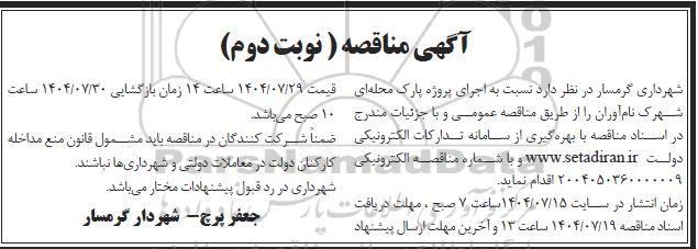 شهرداری گرمسار در نظردارد نسبت به اجرای پروژه پارک محله ای شهرک نام آوران را از طریق مناقصه عمومی و با جزییات مندرج در اسناد مناقصه با بهره گیری از سامانه تدارکات الکترنیکی ستاد ایران و با شماره مناقصه الکترونیکی 2004050360000009 اقدام نماید.