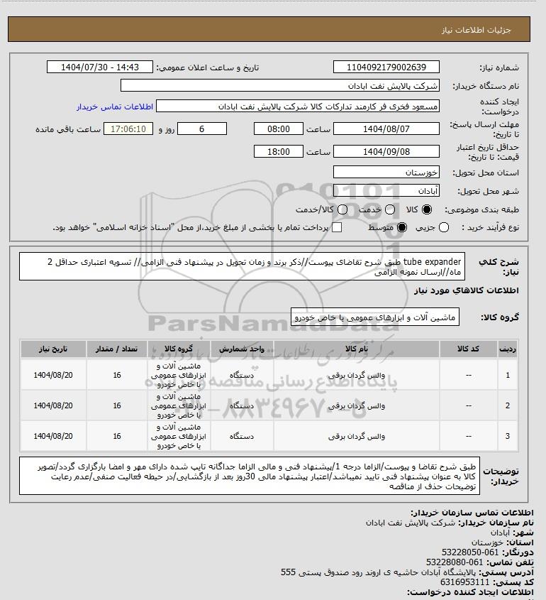 استعلام tube expander طبق شرح تقاضای پیوست//ذکر برند و زمان تحویل در پیشنهاد فنی الزامی// تسویه اعتباری حداقل 2 ماه//ارسال نمونه الزامی, استعلام tube expander طبق شرح تقاضای پیوست//ذکر برند و زمان تحویل در پیشنهاد فنی الزامی// تسویه اعتباری حداقل 2 ماه//ارسال نمونه الزامی