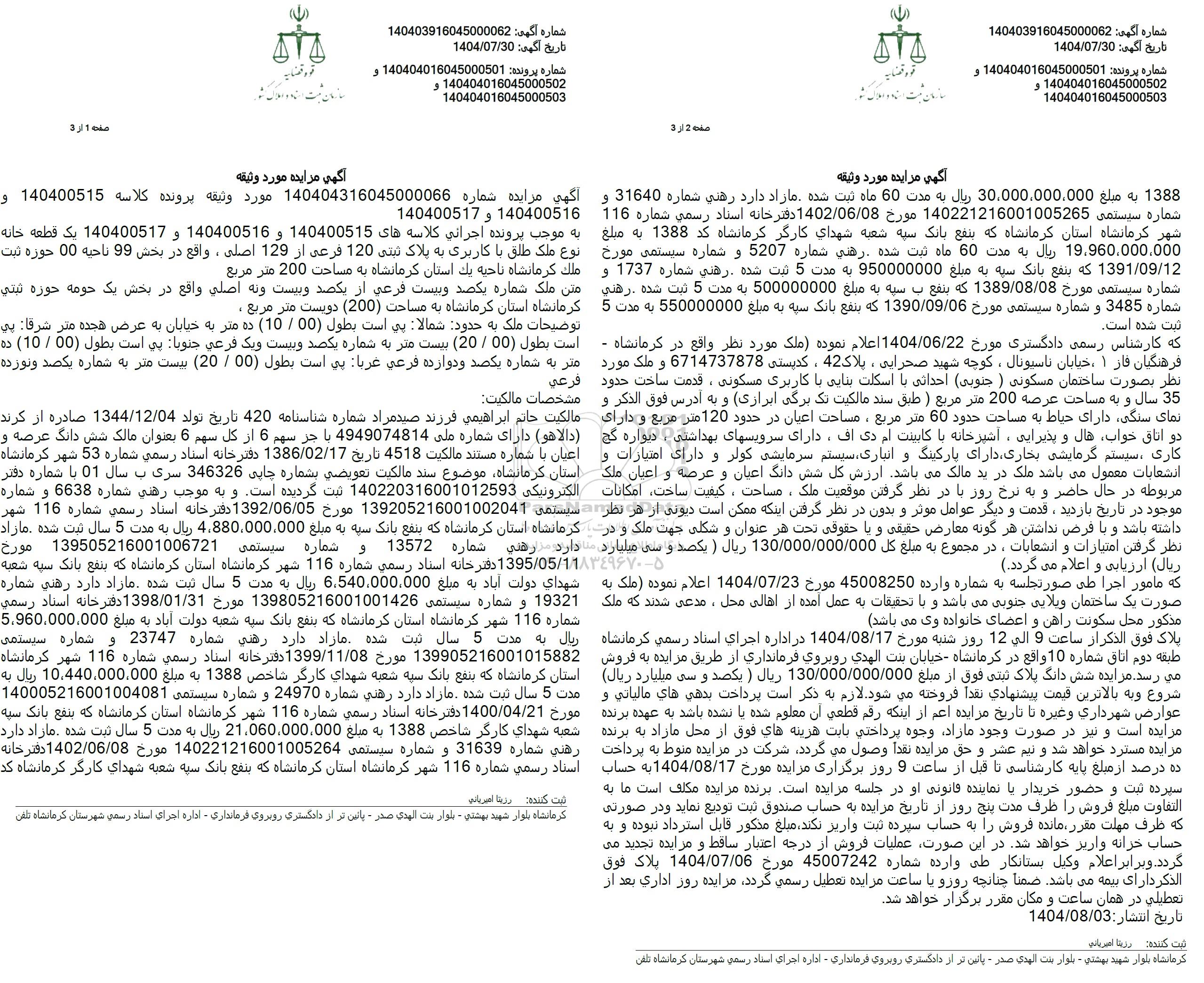 آگهی مزایده شماره 140404316045000066 مورد وثیقه پرونده کلاسه 140400515 و 140400517 140400516 و به موجب پرونده اجرائی کلاسه های 140400515 و 140400516 و 140400517 یک قطعه خانه نوع ملک طلق با کاربری به پلاک ثبتی 120 فرعی از 129 اصلی، واقع در بخش 99 ناحيه 00 حوزه ثبت ملك كرمانشاه ناحيه يك استان کرمانشاه به مساحت 200 متر مربع