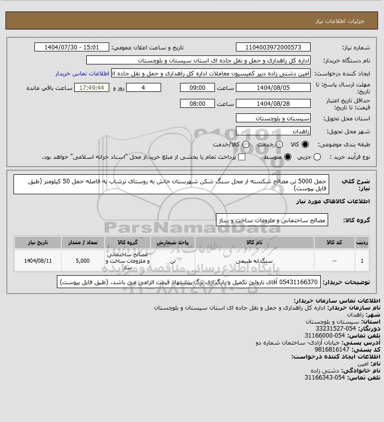 شرح کلی نیاز: حمل 5000 تن مصالح شکسته از محل سنگ شکن شهرستان خاش به روستای ترشاب به فاصله حمل 50 کیلومتر (طبق فایل پیوست)