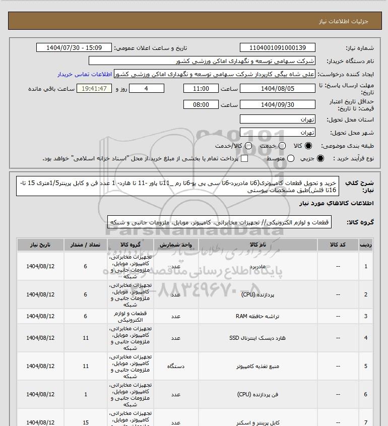 | 1 | -- | مادربرد | عدد | تجهیزات مخابراتی، کامپیوتر، موبایل، ملزومات جانبی و شبکه | 6 | 1404/08/12 |