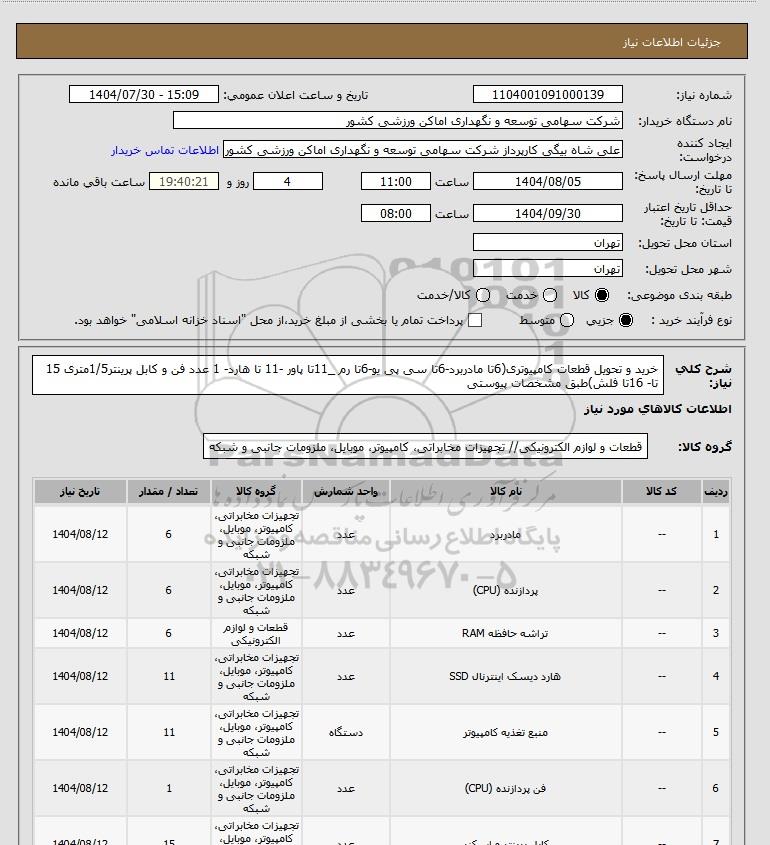 1 -- مادربرد عدد تجهیزات مخابراتی، کامپیوتر، موبایل، ملزومات جانبی و شبکه 6 1404/08/12