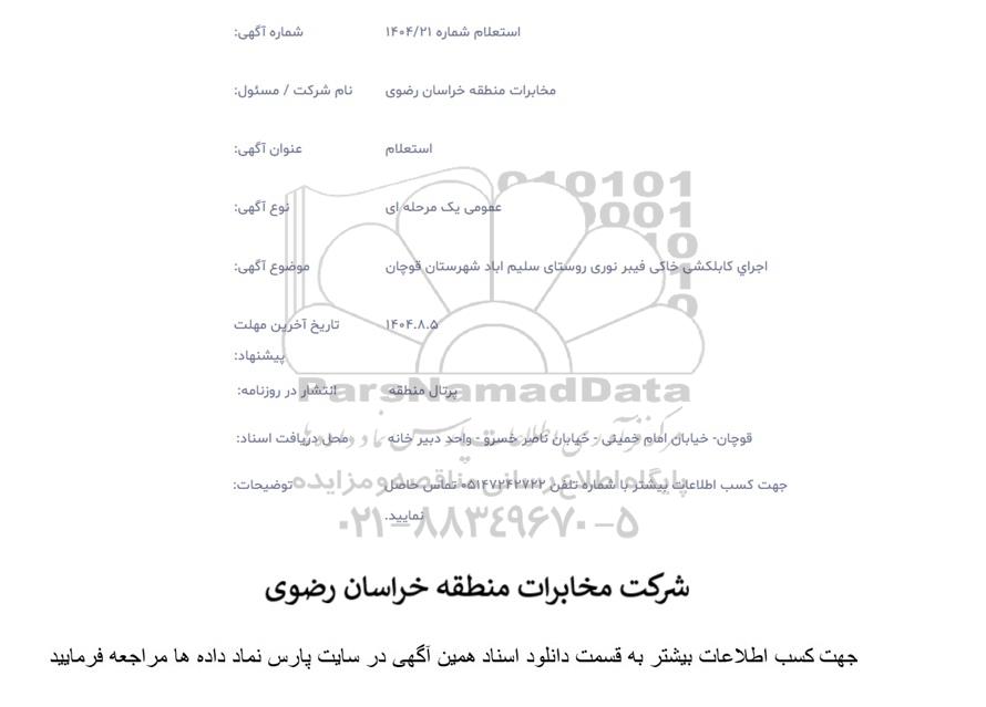 موضوع آگهی: اجرای کابلکشی خاکی فیبرنوری روستای سلیم آباد شهرستان قوچان