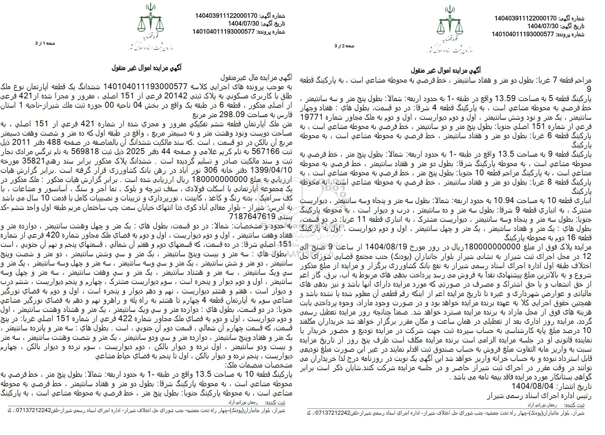 مزایده ششدانگ یک قطعه آپارتمان نوع ملک طلق با کاربری مسکونی به پلاک ثبتی 20142 فرعی از 151 اصلی
