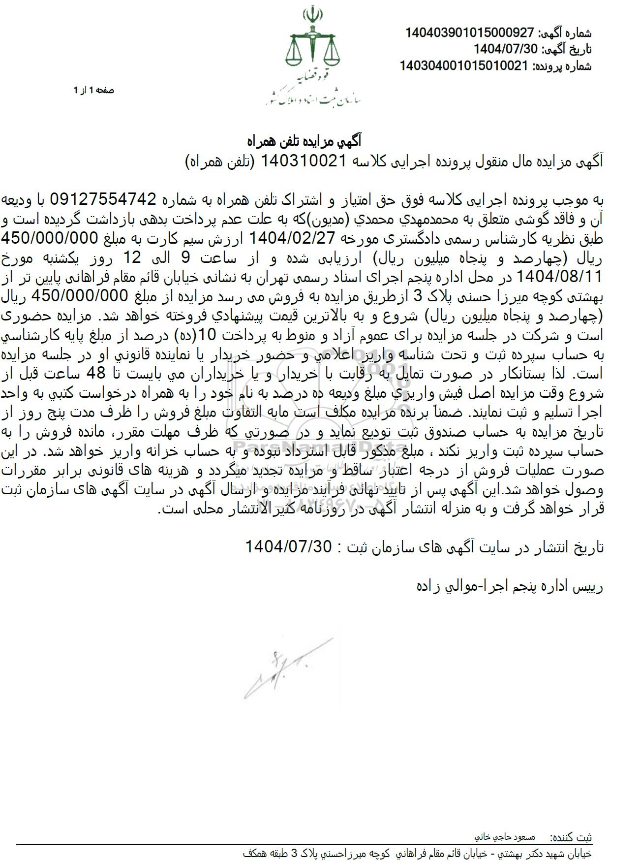 آگهی مزایده مال منقول پرونده اجرایی کلاسه 140310021(تلفن همراه)
