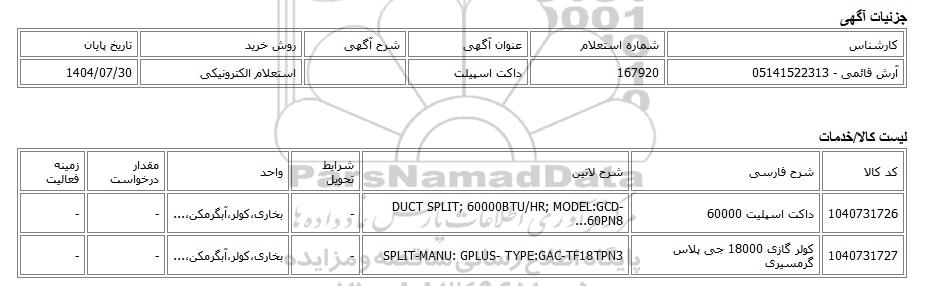آرش قائمی - 05141522313 | 167920 | داکت اسپیلت | استعلام الکترونیکی | 1404/07/30 |