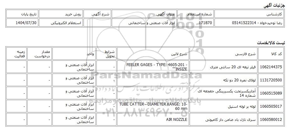 | رضا توحیدخواه - 05141522314 | 171870 | ابزار آلات صنعتی و ساختمانی | استعلام الکترونیکی | 1404/07/30 |