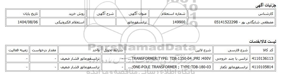 | مصطفی شایگانی پور - 05141522298 | 149900 | ترانسفورماتور | استعلام الکترونیکی | 1404/08/06 |