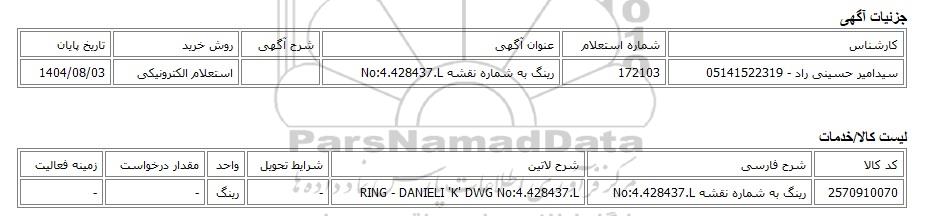 | سیدامیر حسینی راد - 05141522319 | 172103 | رینگ به شماره نقشه No:4.428437.L | استعلام الکترونیکی | 1404/08/03 |