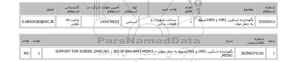 52505012نگهدارنده اسکرین 1661 و 1662مربوط به حمل مواد 1ساخت تجهیزات و قطعات یدکیاستانی1404/08/03عنایت اله نکوئیE.NEKOOIE@KSC.IR