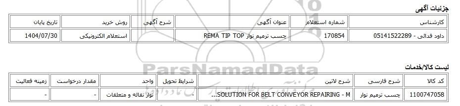 داود فدائی - 05141522289 | 170854 | چسب ترمیم نوار REMA TIP TOP | استعلام الکترونیکی | 1404/07/30 |