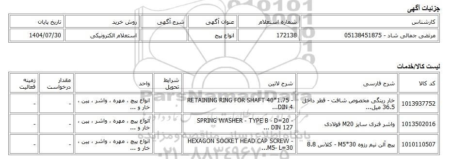 9 استعلام الکترونیکی انواع پیچ مهره واشر پین خار و ... 9740730 1404/08/01 new special not payed خراسان رضوی