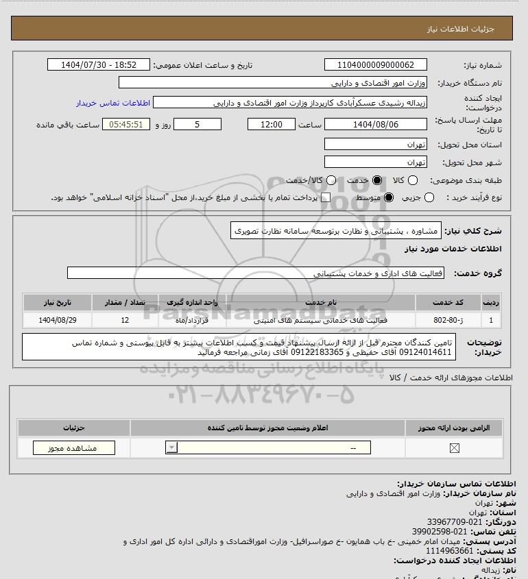شرح کلی نیاز: مشاوره ، پشتیبانی و نظارت برتوسعه سامانه نظارت تصویری