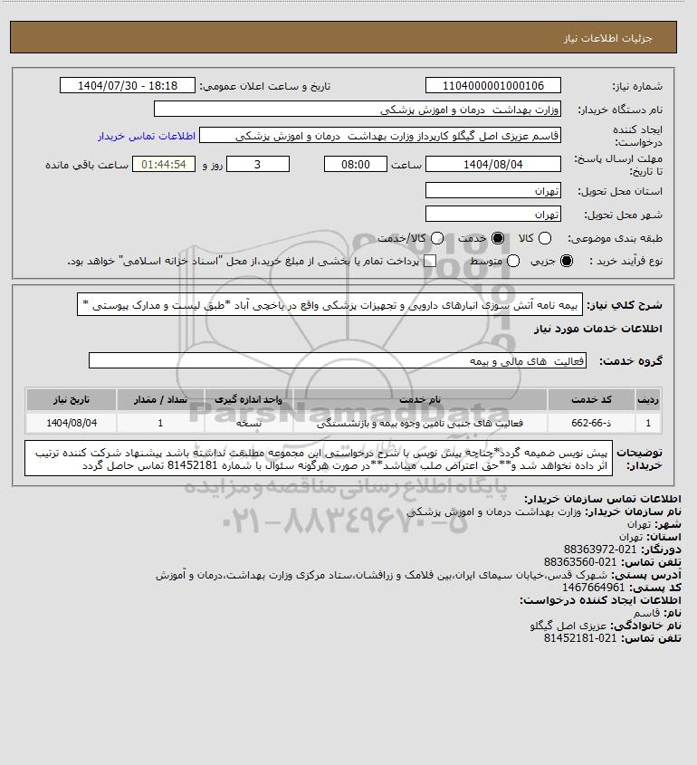 شرح کلی نیاز: بیمه نامه آتش سوزی انبارهای دارویی و تجهیزات پزشکی واقع در یاخچی آباد *طبق لیست و مدارک پیوستی *