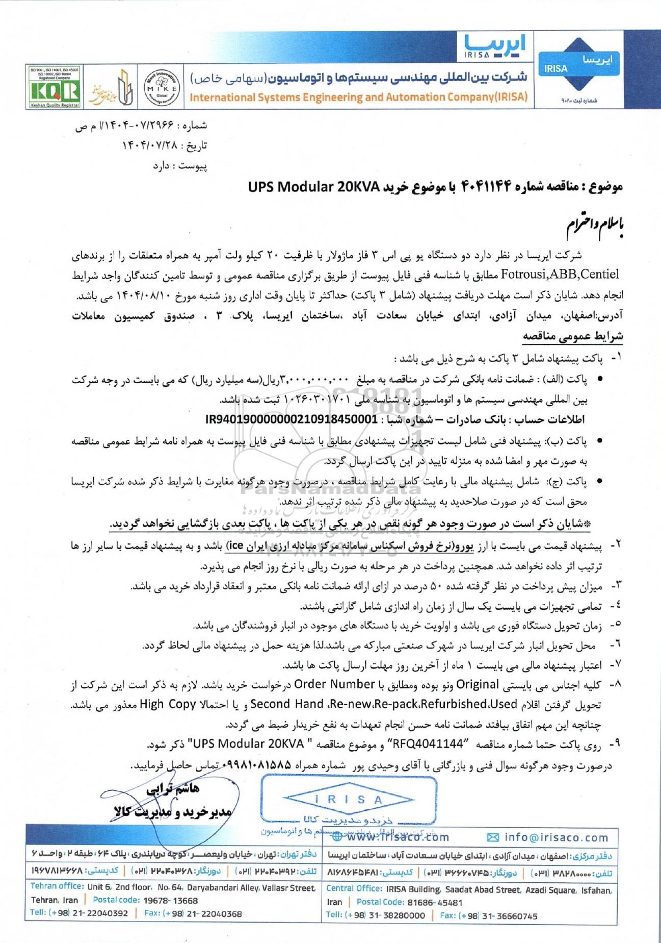 شرکت ایریسا در نظر دارد دو دستگاه یو پی اس 3 فاز ماژولار با ظرفیت 20 کیلو ولت آمپر به همراه متعلقات از برندهای Fotrousi, ABB, Centiel مطابق با شناسه فنی فایل پیوست از طریق برگزاری مناقصه عمومی و توسط تامین کنندگان واجد شرایط انجام دهد. شایان ذکر است مهلت دریافت پیشنهاد (شامل 2 پاکت) حداکثر تا پایان وقت اداری روز شنبه مورخ 1404.08.10 می باشد.