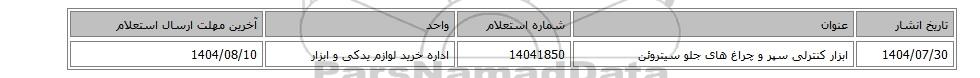 | 1404/07/30 | ابزار کنترلی سپر و چراغ های جلو سیتروئن | 14041850 | اداره خرید لوازم یدکی و ابزار | 1404/08/10 |