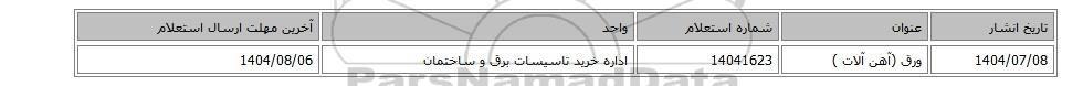 | 1404/07/08 | ورق (آهن آلات ) | 14041623 | اداره خرید تاسیسات برق و ساختمان | 1404/08/06 |