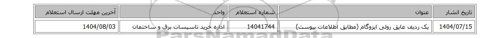 استعلام بها و موضوع استعلام استعلام، یک ردیف عایق رولی ایزوگام (مطابق اطلاعات پیوست) به اطلاع کلیه شرکتها و افراد متخصص واجد شرایط میرساند، آگهی گذار در نظر دارد از طریق استعلام بها، نسبت به انتخاب و دریافت پیشنهادات اقدام نماید. این استعلام با کد آگهی ثبت شده در سامانه خبرگزاری پارس نماد : 9740729 منتشر شده است. مشخصات استعلام : تاریخ شروع استعلام: 1404/08/01 آخرین مهلت ارسال پیشنهاد قیمت : 1404/08/03 و محل اجرای پروژه : استان تهران میباشد. استعلام قیمت مورد درخواست : استعلام، یک ردیف عایق رولی ایزوگام (مطابق اطلاعات پیوست) با دستهبندیهای تخصصی و گروه های مرتبط : انواع عایق های رطوبتی ،حرارتی ،صوتی, مصالح ساختمانی, استعلام اطلاع رسانی میگردد.