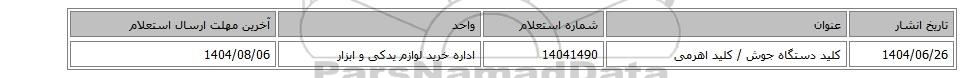 | 1404/06/26 | کلید دستگاه جوش / کلید اهرمی | 14041490 | اداره خرید لوازم یدکی و ابزار | 1404/08/06 |
