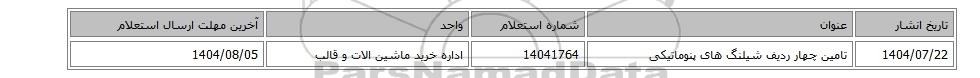 | 1404/07/22 | تامین چهار ردیف شیلنگ های پنوماتیکی | 14041764 | اداره خرید ماشین الات و قالب | 1404/08/05 |