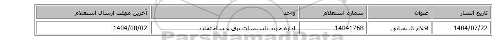 | 1404/07/22 | اقلام شیمیایی | 14041768 | اداره خرید تاسیسات برق و ساختمان | 1404/08/02 |