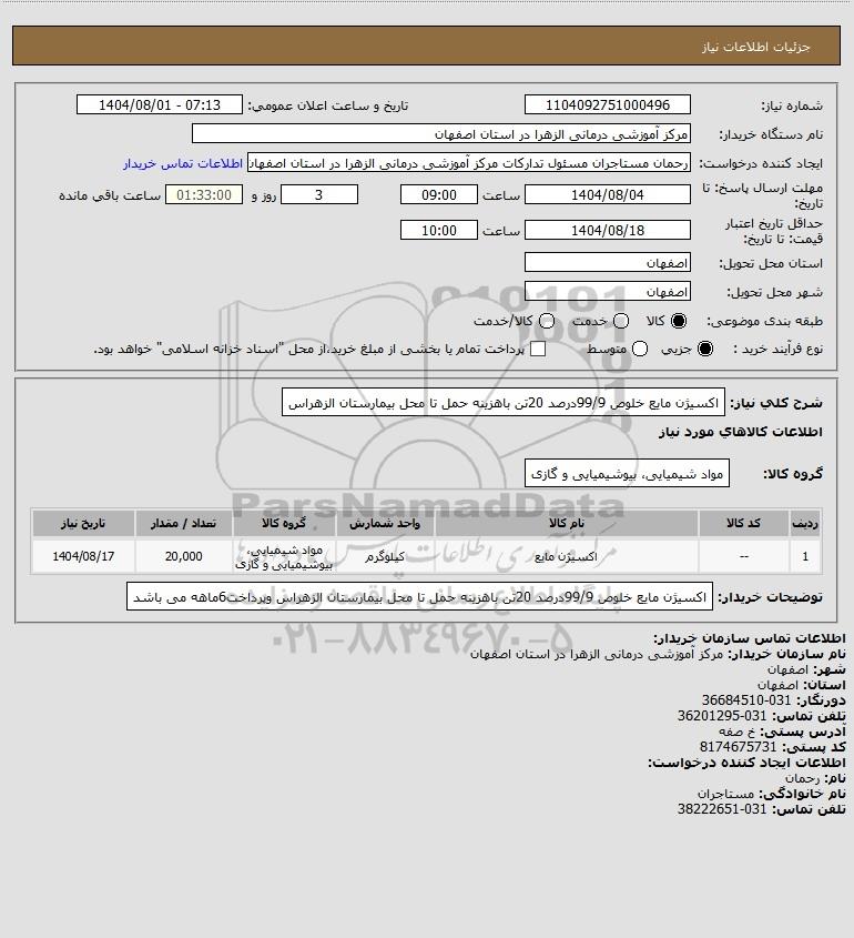شرح کلی نیاز: اکسیژن مایع خلوص 99/9درصد 20تن باهزینه حمل تا محل بیمارستان الزهراس