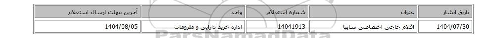 | 1404/07/30 | اقلام چاچی اختصاصی سایپا | 14041913 | اداره خرید دارایی و ملزومات | 1404/08/05 |