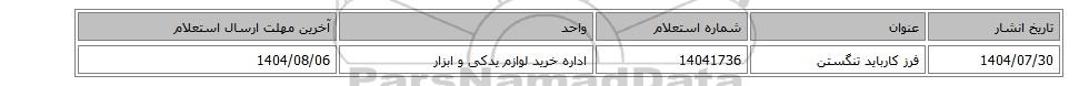 | 1404/07/30 | فرز کارباید تنگستن | 14041736 | اداره خرید لوازم یدکی و ابزار | 1404/08/06 |