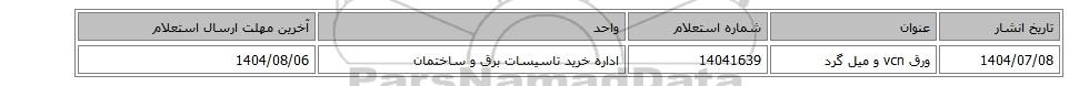 | 1404/07/08 | ورق vcn و میل گرد | 14041639 | اداره خرید تاسیسات برق و ساختمان | 1404/08/06 |