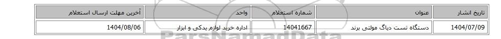 | 1404/07/09 | دستگاه تست دیاگ مولتی برند | 14041667 | اداره خرید لوازم یدکی و ابزار | 1404/08/06 |