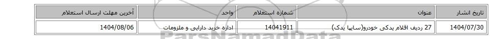 | 1404/07/30 | 27 ردیف اقلام یدکی خودرو(سایپا یدک) | 14041911 | اداره خرید دارایی و ملزومات | 1404/08/06 |