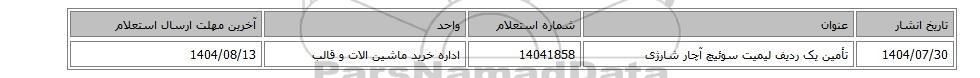 | 1404/07/30 | تأمین یک ردیف لیمیت سوئیچ آچار شارژی | 14041858 | اداره خرید ماشین الات و قالب | 1404/08/13 |