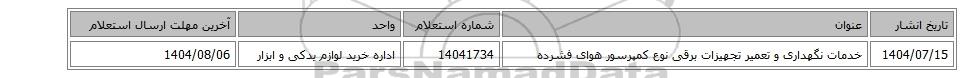 | 1404/07/15 | خدمات نگهداری و تعمیر تجهیزات برقی نوع کمپرسور هوای فشرده | 14041734 | اداره خرید لوازم یدکی و ابزار | 1404/08/06 |