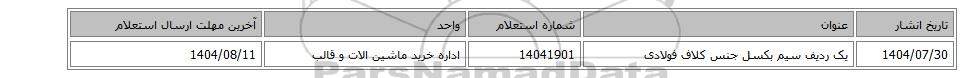 | 1404/07/30 | یک ردیف سیم بکسل جنس کلاف فولادی | 14041901 | اداره خرید ماشین الات و قالب | 1404/08/11 |
