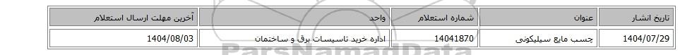 | 1404/07/29 | چسب مایع سیلیکونی | 14041870 | اداره خرید تاسیسات برق و ساختمان | 1404/08/03 |