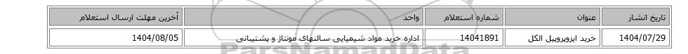 | 1404/07/29 | خرید ایزوپروپیل الکل | 14041891 | اداره خرید مواد شیمیایی سالنهای مونتاژ و پشتیبانی | 1404/08/05 |