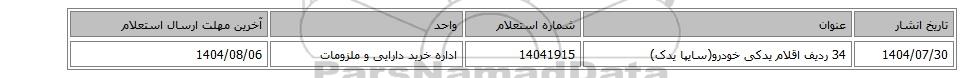 | 1404/07/30 | 34 ردیف اقلام یدکی خودرو(سایپا یدک) | 14041915 | اداره خرید دارایی و ملزومات | 1404/08/06 |