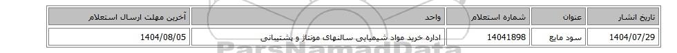 | 1404/07/29 | سود مایع | 14041898 | اداره خرید مواد شیمیایی سالنهای مونتاژ و پشتیبانی | 1404/08/05 |