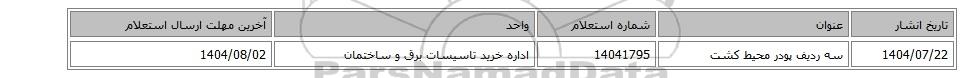| 1404/07/22 | سه ردیف پودر محیط کشت | 14041795 | اداره خرید تاسیسات برق و ساختمان | 1404/08/02 |