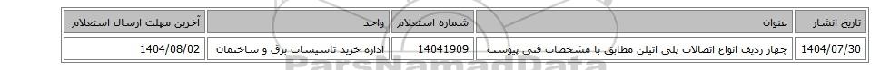 | 1404/07/30 | چهار ردیف انواع اتصالات پلی اتیلن مطابق با مشخصات فنی پیوست | 14041909 | اداره خرید تاسیسات برق و ساختمان | 1404/08/02 |