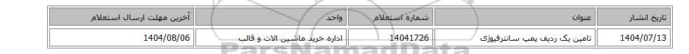 | 1404/07/13 | تامین یک ردیف پمپ سانترفیوژی | 14041726 | اداره خرید ماشین الات و قالب | 1404/08/06 |