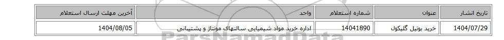 | 1404/07/29 | خرید بوتیل گلیکول | 14041890 | اداره خرید مواد شیمیایی سالنهای مونتاژ و پشتیبانی | 1404/08/05 |