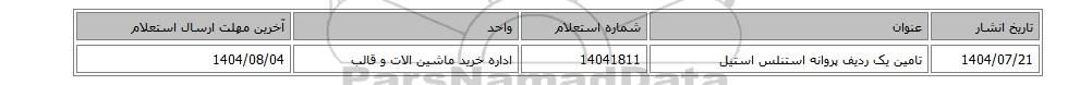 | 1404/07/21 | تامین یک ردیف پروانه استنلس استیل | 14041811 | اداره خرید ماشین الات و قالب | 1404/08/04 |
