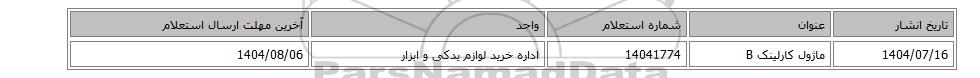 | 1404/07/16 | ماژول کارلینک B | 14041774 | اداره خرید لوازم یدکی و ابزار | 1404/08/06 |
