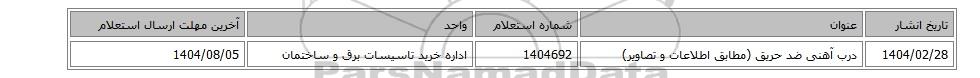 | 1404/02/28 | درب آهنی ضد حریق (مطابق اطلاعات و تصاویر) | 1404692 | اداره خرید تاسیسات برق و ساختمان | 1404/08/05 |