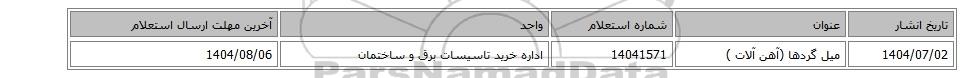 | 1404/07/02 | میل گردها (آهن آلات ) | 14041571 | اداره خرید تاسیسات برق و ساختمان | 1404/08/06 |
