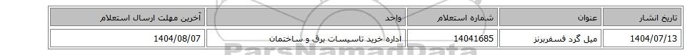 | 1404/07/13 | میل گرد فسفربرنز | 14041685 | اداره خرید تاسیسات برق و ساختمان | 1404/08/07 |